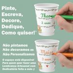 Existe um espaço no Copo para Personalizar artesanalmente, a própria pessoa com Canetinha pode escrever e Personalizar da forma que preferir, ou a criança pode colorir as partes em branco da forma que quiser