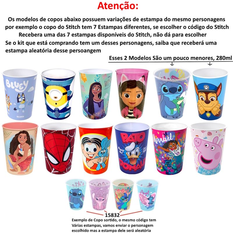 Obs Importante: Copos Lilo Stitch e Patrulha Canina tem tamanhos ligeiramente menores, capacidade de 280ml.