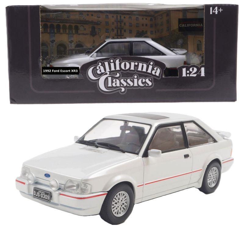 1992 Ford Escort XR3Marca do produto: California Toys.Coleção: California ClassicsEscala: 1/24 (aproximadamente 17 cm de comprimento).Pneus de Borracha.Miniatura em Metal com Partes de Plástico.Não abre nenhum compartimento (portas, capô e porta malas).