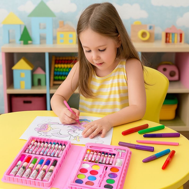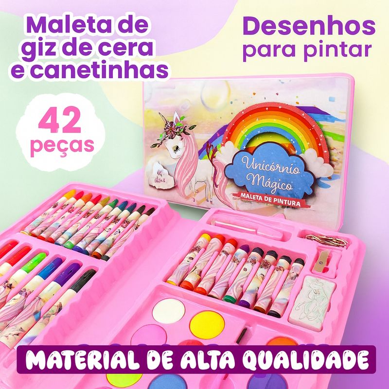 Desperte a criatividade com a Maleta de Pintura Infantil Unicórnio! Este kit completo de 42 peças, com tema de unicórnio, inclui canetinhas e materiais escolares essenciais. Perfeito para desenvolver a coordenação motora e a expressão artística, ele proporciona horas de diversão mágica para os pequenos artistas.