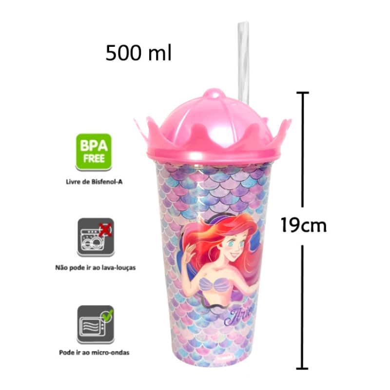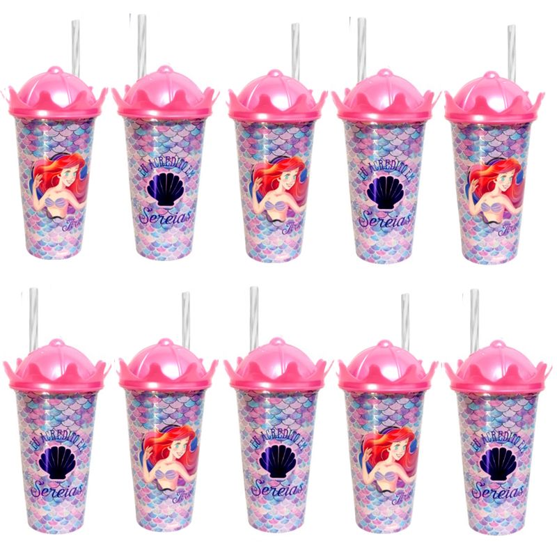 Copo com Coroa e Canudo da Pequena Sereia Aniversário e Decoração de Festas p/ Sacolinha Surpresa