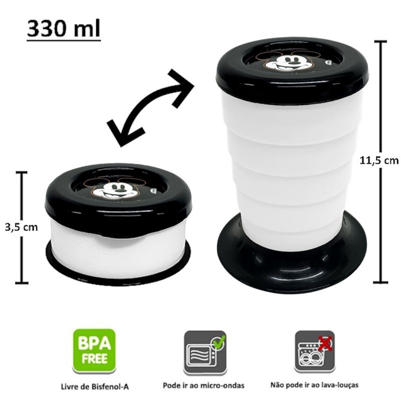 O Copo Retrátil do Mickey Mouse 330ml é ideal para decoração de festa de aniversário infantil e como lembrancinha. Ele é dobrável e compacto, fácil de transportar. Feito de silicone seguro (livre de BPA) com tampa anti-vazamento, é durável e incentiva a sustentabilidade, sendo uma lembrança funcional e reutilizável.