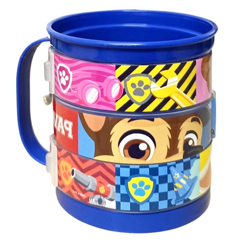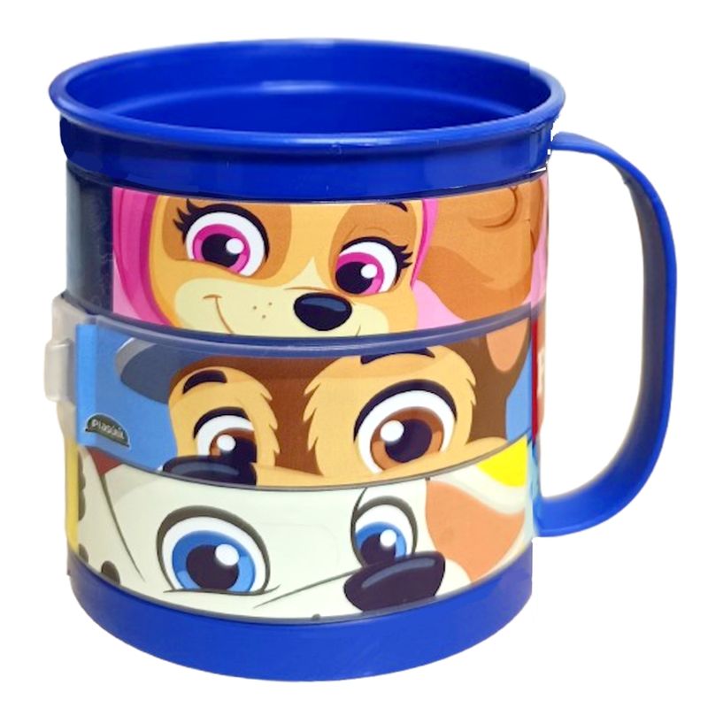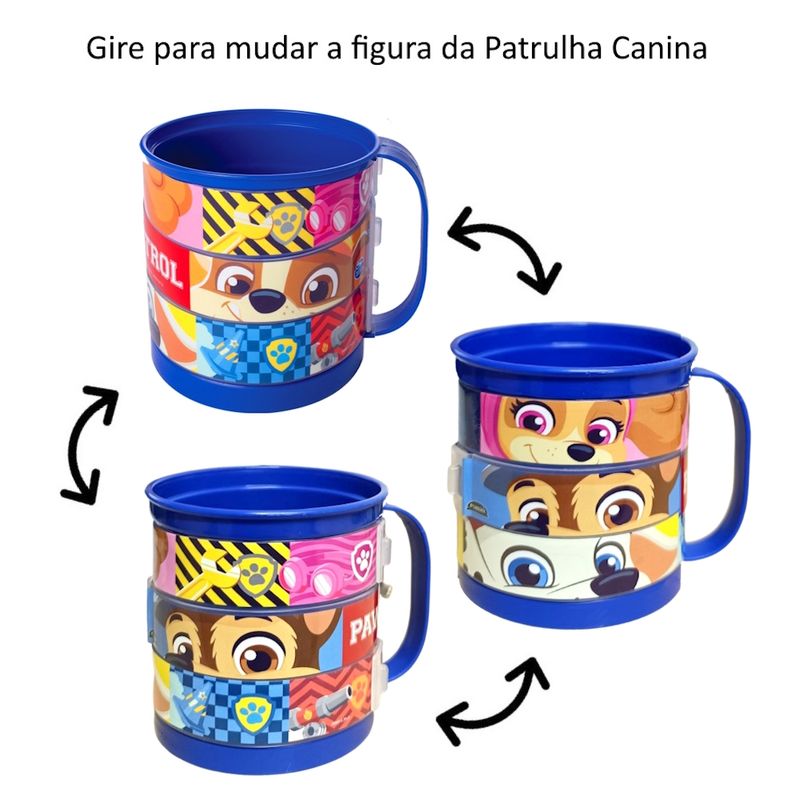 Linda caneca com estampa dos personagens da Patrulha Canina com um formato diferente. A Plasútil como sempre inovando, nesta caneca você consegue trocar a faixa com o rostinho do personagem e ir girando até formar o rostinho preferido. Pode ser usado para armazenar doces em festa infantil. Ótima opção de presente, as crianças vão se divertir