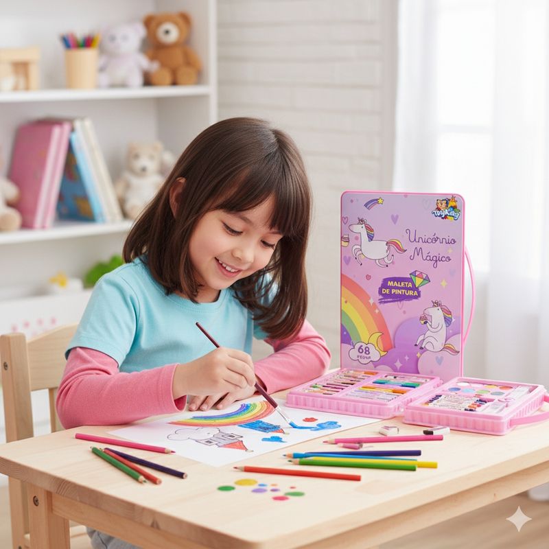 A Maleta de Pintura Unicórnio Mágico é o presente perfeito para as crianças que adoram pintar. Com um total de 68 peças, este kit oferece tudo o que as crianças precisam para soltar a imaginação e criar obras de arte incríveis. A maleta é feita de material resistente e possui um design moderno e colorido. Ela é perfeita para armazenar e transportar os materiais para qualquer lugar. É uma ótima maneira de estimular a criatividade e a imaginação das crianças.