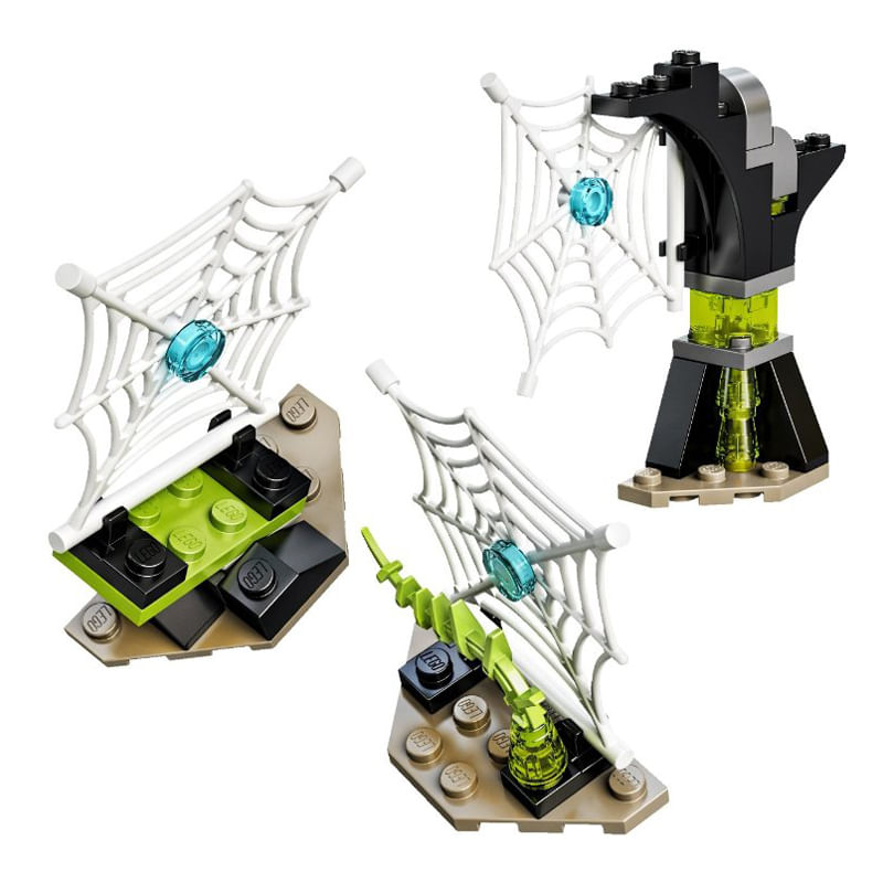 Incluída minifigura de Sparratus com armadura e 2 armas mais Speedorz de aranha, dentes verdes brilhantes, 3 teias de aranha, cabo de disparo, power-up, 6 cristais de CHI e 5 cartas de jogo.