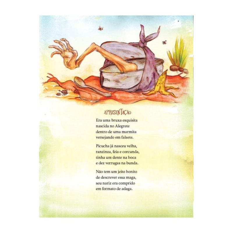 Numa floresta assombrada vivia uma bruxa muito esquisita chamada Picucha junto com seus bichos igualmente esquisitos. Nascida velha, ranzinza e corcunda, ela tinha cabelo extravagante, comia de boca aberta e odiava água e chuveiro. Como boa bruxa, gostava mesmo era de assustar todo mundo. Mas um certo dia o seu povo, de tanto ser assustado, perdeu o medo da bruxa. Assim Picucha decide partir para a cidade grande e provar que ainda consegue matar todos de susto… até encontrar um poeta. SUGESTÃO DE IDADE PARA LEITURA: - Leitura compartilhada: a partir de 3 anos - Leitura independente: a partir de 6 anos