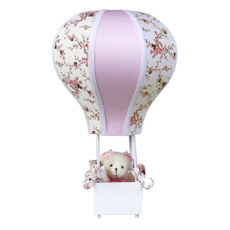 O Abajur Balãozinho é feito com armação de arame galvanizado, acetato forrado em tecido e a cestinha em madeira com ursinha.