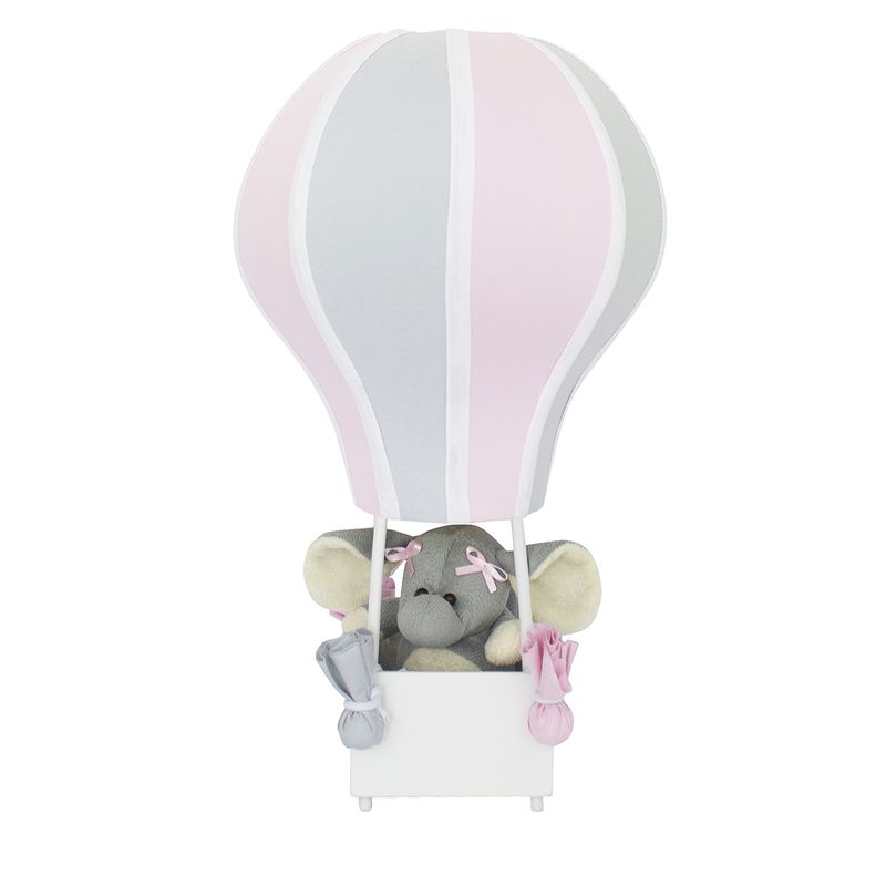O Abajur Balãozinho é feito com armação de arame galvanizado, acetato forrado em tecido e a cestinha em madeira com elefante.