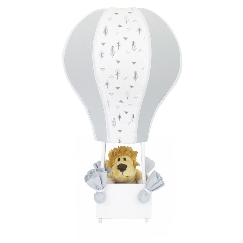 O Abajur Balãozinho é feito com armação de arame galvanizado, acetato forrado em tecido e a cestinha em madeira com leão.