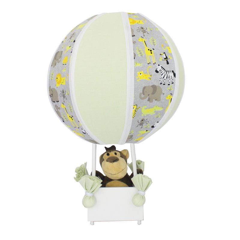 O Abajur Balãozinho é feito com armação de arame galvanizado, acetato forrado em tecido e a cestinha em madeira com macaco.