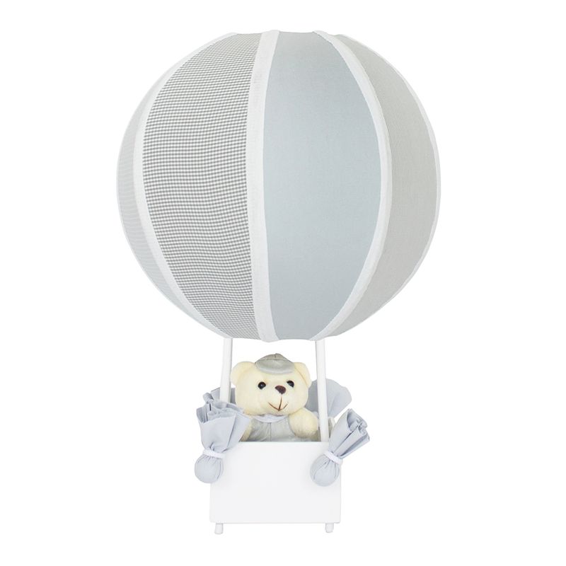 O Abajur Balãozinho é feito com armação de arame galvanizado, acetato forrado em tecido e a cestinha em madeira com ursinho.