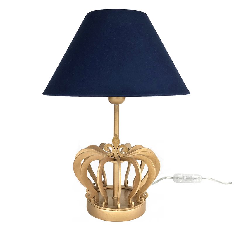 Abajur com base de madeira dourada decorado com coroa e cúpula forrada com tecido.