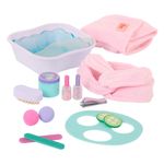Proporcione um dia de relaxamento completo com o Kit de Spa Our Generation! Com banheira para os pés, máscara facial, pepinos, cremes, esmaltes e mais, ele traz tudo para cuidar da sua boneca com estilo. Compatível com bonecas de 46 cm, é perfeito para criar histórias de autocuidado e diversão. Um toque de beleza e imaginação em cada momento! Boneca vendida separadamente.