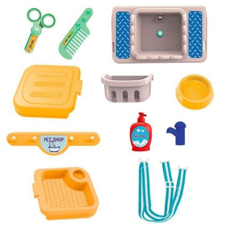 kit 2 em 1: Mochila e Petshop. Vem com Vários Acessórios. Tudo Pode Ser Carregado Para Qualquer Lugar Dentro da Mochilinha! 01 pet, 01 mochila com alças para transporte, 01 pote de ração, 02 caixas de ração, 01 pente, 01 secador, 01 tesoura, 01 suporte para pendurar utensílios, 01 pia com torneira, 01 extensor de pia, 01 cartela de adesivos, 01 cesta para pendurar, 01 frasco de shampoo e 01 base para pet