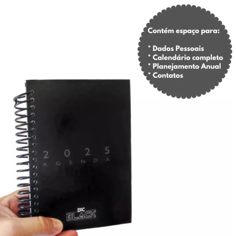 CARACTERÍSTICAS DO PRODUTO Marca: DAC Comprimento x Altura x Largura: Produto - 134mm x 190mm x 20mm Comprimento x Altura x Largura: Embalagem - 164mm x 220mm x 50mm Indicação de idade: +4 anos Material: Papel Cartonado Peso: 300g Cor: Preto Sku: 4550DAC Ean: 7908689911989 Detalhes: - Tamanho A5; - Com 336 páginas; - Gramatura das folhas de 90 g/m²; - Agenda com espiral; - Datada com o ano de 2025. Instrução de uso e cuidados: - Abrir com cuidado para preservar a encadernação; - Escrever suavemente para evitar marcar as páginas; - Evitar dobrar páginas; use marcadores; - Manter longe de água para evitar molhar ou manchar; - Evitar calor excessivo para não queimar ou deformar; - Não expor ao sol direto por longos períodos, para não desbotar ou deformar; - Manter em local seco e arejado para evitar mofo; - Usar canetas adequadas para evitar manchas; Esses cuidados ajudam a conservar o caderno por mais tempo. A Agenda Maior A5 All Black combina estilo e funcionalidade, apresentando um design moderno com uma capa resistente em cor preta. Seu tamanho maior permite anotações detalhadas, enquanto as páginas de alta qualidade suportam diferentes tipos de canetas. Com calendários mensais e semanais, e espaços para anotações e contatos, esta agenda é ideal para estudantes, profissionais e criativos que buscam organizar sua rotina de forma eficiente e elegante.