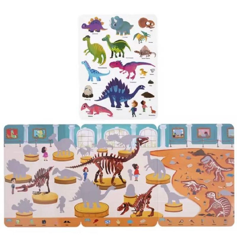 Cada adesivo vem com seu nome, além disso você pode fazer uma busca e encontrar objetos para procurar em um museu, proporcionando um aprendizado divertido sobre os dinossauros.