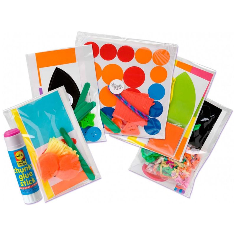 Inclui 150 adesivos, 2 olhos, 6 limpadores de cachimbo, 2 pompons, franjas, papel de seda e papel amassado, 10 palitos de artesanato, 6 botões e instruções.