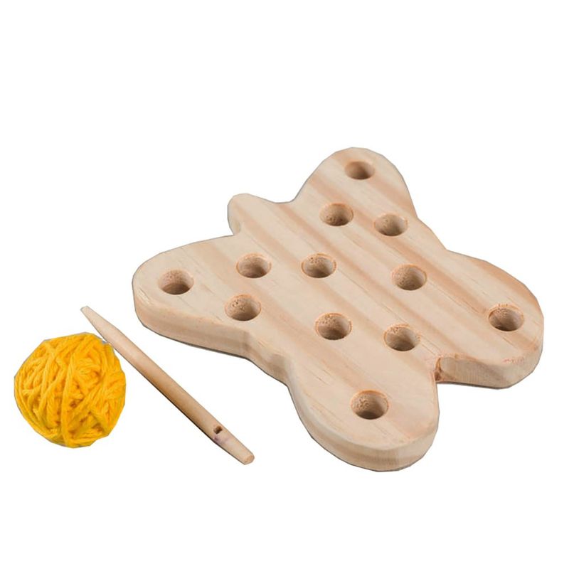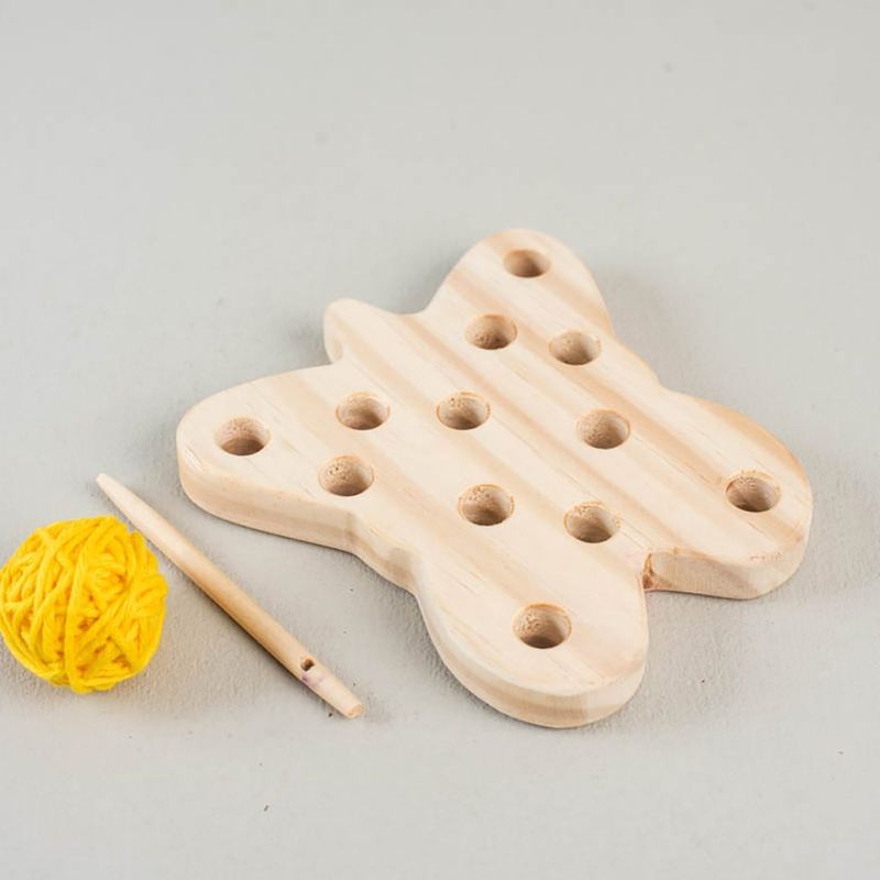 O Alinhavo de Borboleta em madeira vem acompanhado de novelo 100% algodão e agulha de madeira para iniciar a atividade, mas você pode deixar a criatividade solta e usar fitas de cetim, barbantes e cordão (pode ser até cadarço velho que você pode pintar com canetinha para ele ficar lindo de novo!).