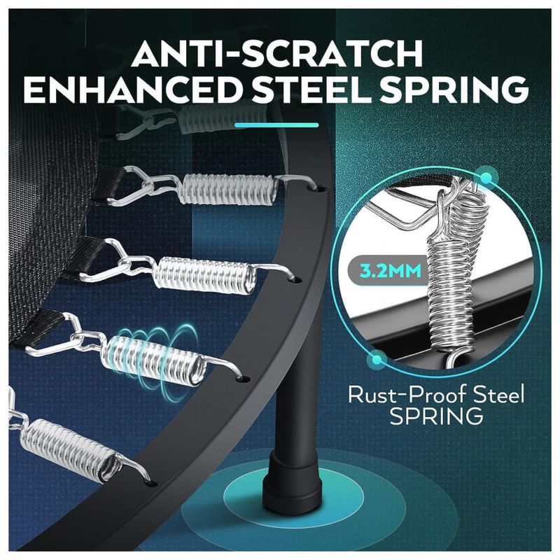 Aço especial à prova de ferrugem e molas aprimoradas Graças à constante pesquisa em materiais de qualidade e processos de fabricação, o trampolim de fitness pode suportar o uso duradouro sem ferrugem ou fora de forma. 32 molas aprimoradas e 6 pernas de aço inoxidável duráveis e firmes garantem que a capacidade de peso máximo suporte até 100 kg.