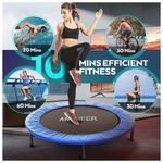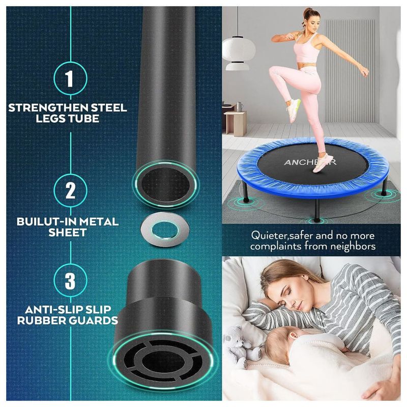 Antiderrapante e incrivelmente silencioso em uso Com design exclusivo para melhorar as tampas de borracha e o tapete de salto, o mini trampolim será bem mantido no lugar e proporcionando uma experiência de salto mais estável e segura e, portanto, também torna possível para crianças em idade 10, sob tutela de adultos, para fazer exercícios aeróbicos. Também reduz efetivamente os ruídos otimizando o tapete do trampolim.