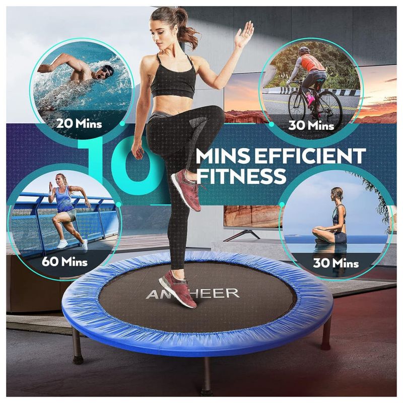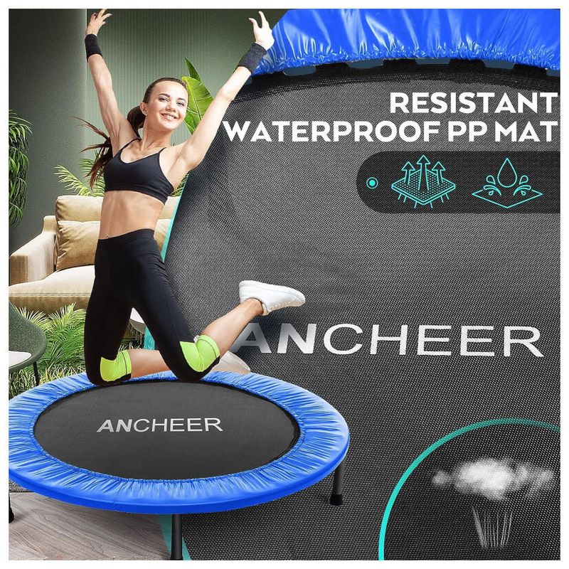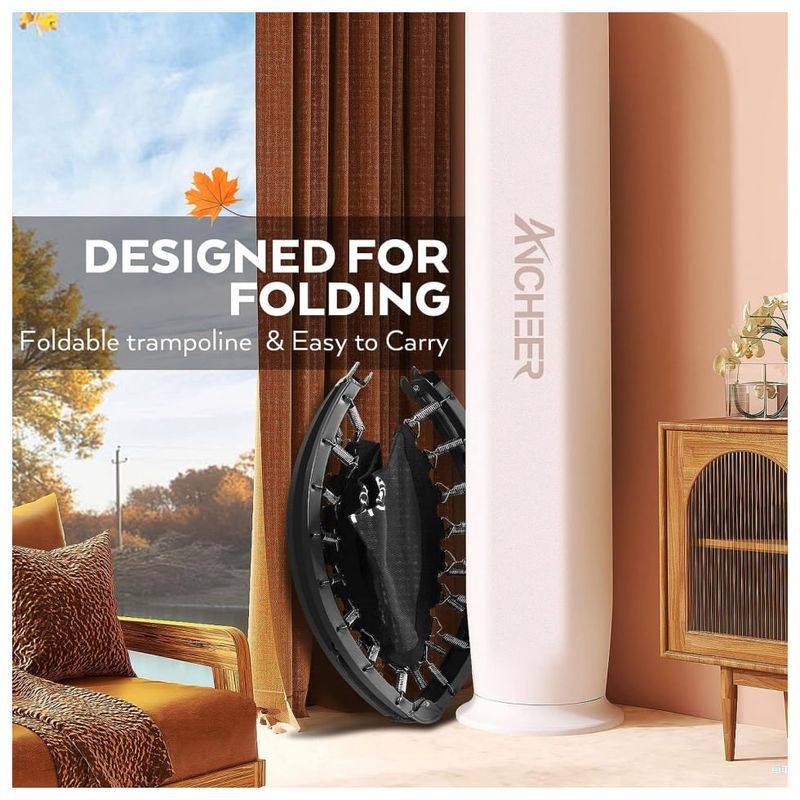 Dobrável e fácil de transportar O mini trampolim ANCHEER é projetado exclusivamente para dobrar, o que é perfeito para sala de estar, jardim, quarto, escritório ou outro espaço limitado etc. Com o design dobrável, pode ser dobrado duas ou uma vez, economizando você muito espaço de zenamento e transportar seu trampolim de um quarto para o outro será mais fácil.