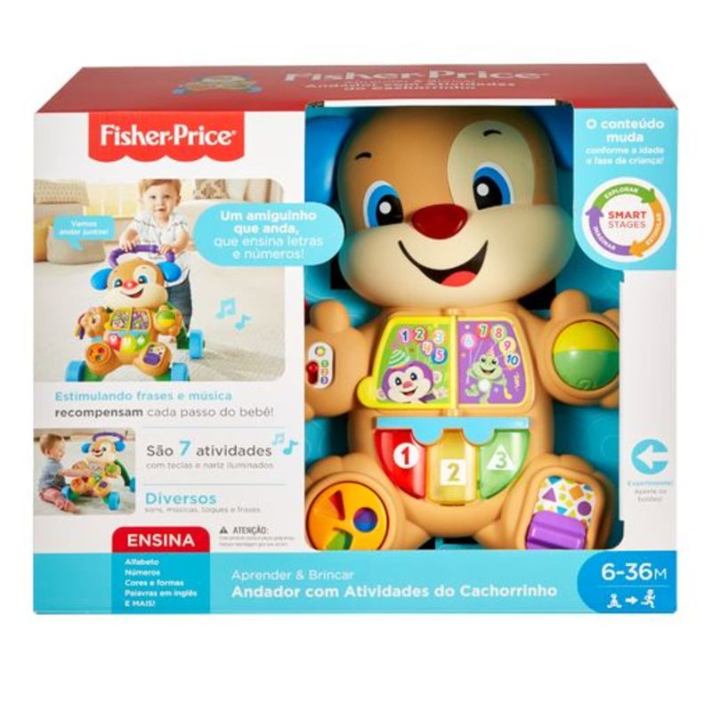 Andador para Bebês Cachorrinho que Anda Marca: Fisher-Price - Mattel Idade Recomendada: De 6 a 36 Meses Vamos dar uma volta, bebê! O Cachorrinho é o amigo perfeito para o seu bebê, proporcionando atividades manuais para bebês que sentam e diversas frases de incentivo e apoio aos primeiros passinhos. Conforme as crianças crescem e começam a andar, o Cachorrinho vai ensinando o alfabeto, formas, cores, números e até mesmo palavras em espanhol! Onde o desenvolvimento se transforma em diversão™ Aprendizado: Músicas e frases divertidas ensinam ao seu bebê o alfabeto, as cores, os números, palavras em espanhol e muito mais! Coordenação motora grossa: Os pequenos músculos trabalham muito quando os bebês sentados se esticam para alcançar algo e interagem com as atividades, e quando fazem o esforço de se levantar e andar atrás do andador. Curiosidade e descoberta: Conforme os bebês descobrem como ativar as músicas e frases, apertando os botões ou empurrando o andador, eles notam que suas ações podem ter consequências divertidas—ei, isso se chama causa e efeito!
