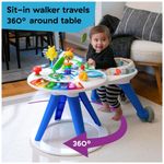 O andador oferece 3 alturas para um ajuste perfeito e gira 360 graus ao redor da mesa enquanto permanece estacionário. A mesa é ideal para brincadeiras em grupo, acomodando várias crianças.