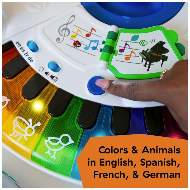 Com mais de 15 brinquedos e atividades, promove o aprendizado STEAM e desenvolve habilidades motoras finas e de causa e efeito, incluindo um piano luminoso que ensina cores e nomes de animais em inglês, francês e espanhol.