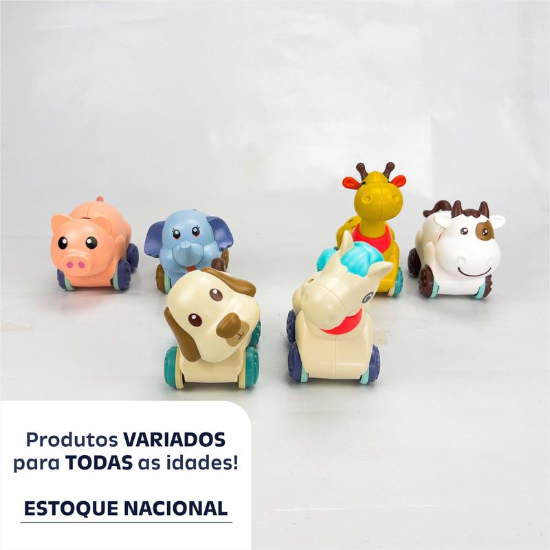 CONJUNTO DE CARRINHOS A FRICÇÃO – ANIMAIS QUE DIVERTEM E ESTIMULAM O MOVIMENTO O conjunto de carrinhos de fricção com animais é pura diversão para os pequenos. Cada bichinho – cachorrinho, porquinho, vaquinha, elefantinho, girafinha e cavalinho – ganha vida com rodinhas macias e movimento suave. Um brinquedo que encanta pela simplicidade e ajuda no desenvolvimento motor e sensorial. Além de brincar empurrando os carrinhos, a criança pode girar a cabeça dos animais, estimulando a exploração tátil e visual. Uma forma divertida e segura de incentivar os primeiros movimentos, como engatinhar e perseguir os brinquedos. --------------------------------------------------- ESPECIFICAÇÕES TÉCNICAS: