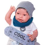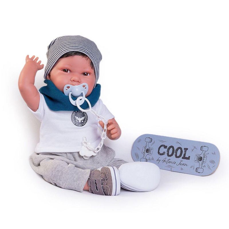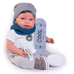 O boneco vem com um conjunto fashion que inclui gorro, gola, camiseta, calça e tênis, oferecendo um look skatista descolado. Inclui uma chupeta com corrente, adicionando um detalhe charmoso e prático ao conjunto. Cada peça foi cuidadosamente projetada para refletir o estilo skatista, tornando o boneco ainda mais atraente e divertido.