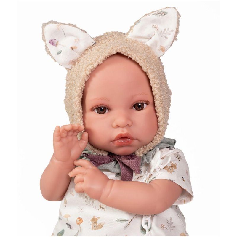 Acompanha sling prático para transporte, permitindo que a criança leve o boneco para passear com conforto e segurança.Corpo macio de tecido e membros em vinil suave, ideal para abraçar e proporciona um toque realista.Extremidades articuladas, permite posicionar o boneco como um bebê de verdade, ampliando as possibilidades de brincadeira.Traje fofo com touquinha de orelhinhas, adiciona um charme especial e estimula a imaginação.Inclui chupeta e conjunto de roupinhas (touca, camiseta, shortinho), completa a experiência de cuidado e diversão.