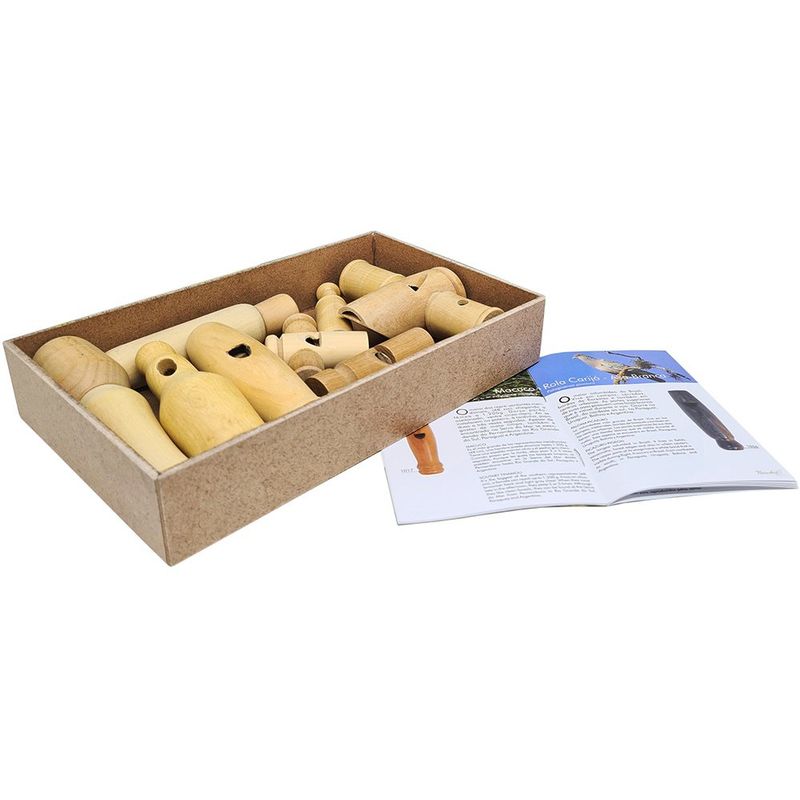 Apitos que compõem a caixa: Codorna/Inhambuguaçú/Chororó/Macuco/Marrecão/Perdiz/Rola/Tucano/Urú.