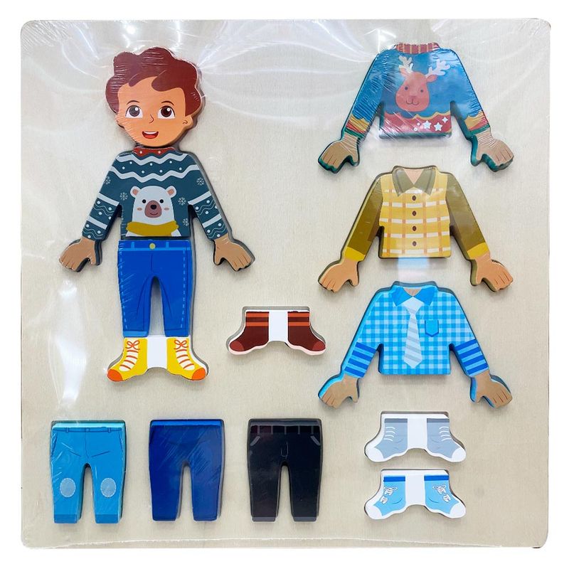Brinquedo Didático em Madeira com Peças de Roupas Divertidas e Coloridas Para Encaixe. Um Divertido Jogo de Vestir e Mudar As Roupinhas Que Estimula a Coordenação Motora, Concentração, Aprendizado e a Criatividade. 1 Base com 13 Peças em Madeira.