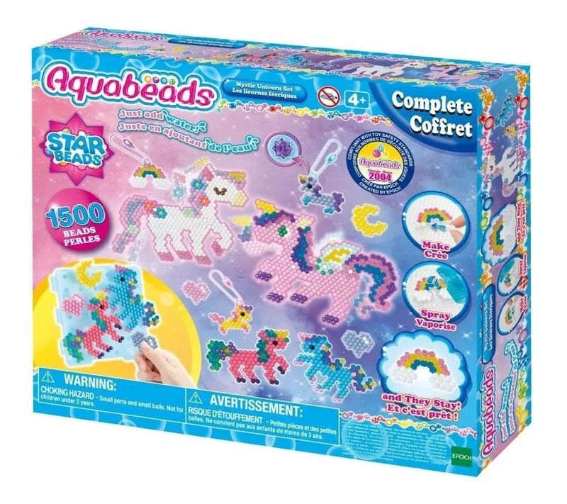 O conjunto Mystic Unicorn vem com 1500 beads em 24 cores, folhas de modelos e instruções.