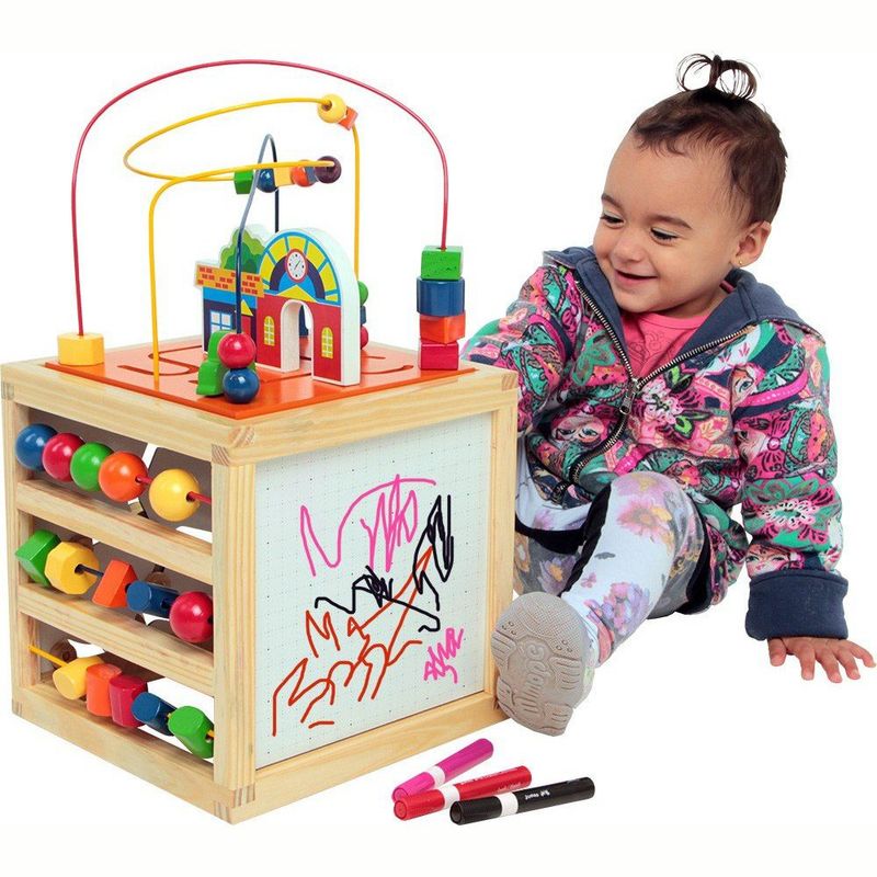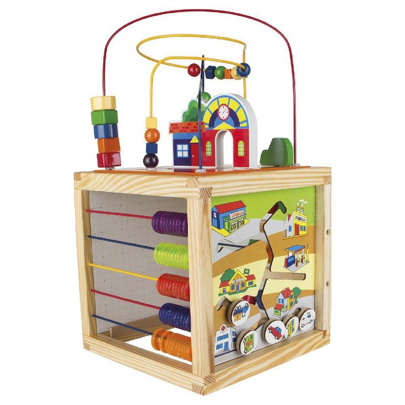 O Aramado Casinha é um brinquedo interativo com 5 diferentes atividades que irão prender a atenção da criançada. Brinquedo confeccionado em madeira, M.D.F. P.V.C. e arame. Em forma de Cubo com a parte superior e laterias compostas por 5 atividades: Aramado casinha: composto por 03 circuitos e 21 peças de formas variadas e coloridas + 02 carrinhos coloridos. Formas e Cores: composto por 3 "linhas" de arame e 15 peças coloridas. Ábaco: composto por 5 "linhas" de arame e 50 argolinhas de P.V.C. coloridas. Quadrinho rabiscos de iniciação: Confeccionado em M.D.F. Padrão BP "Dots", com ilustrações de pontinhos e Carrinhos e caminhos: Composto por 4 peças para seguir o percurso (Ex:supermercado tem a Van, a fábrica tem o caminhão...). Brinquedo pintado e serigrafado com tinta em policromia ultravioleta atóxica, peças e arames pintados com tinta atóxica colorida. Medida do produto fechado: 27 x 27 x 27 cm. Medida aproximada do produto montado: 27 x 27 x 50 cm. Embalagem: Caixa de papel microondulado ilustrado medindo 29 x 29 x 28 cm. Lacrada com película de P.V.C. encolhível.