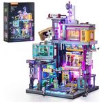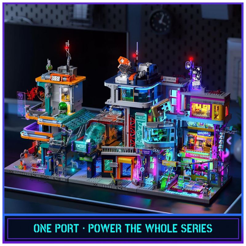 O kit Lumibricks Arcade Cyberpunk Game Stack contém 2580 peças plásticas ABS que formam um complexo de entretenimento vertical em múltiplos níveis, seguindo a filosofia urbana cyberpunk com módulos intercambiáveis: zona de jogos retrô, cápsula VR de combate, cápsula interface cérebro-computador e cápsula de prêmios, permitindo sequências de montagem flexíveis por módulo.
