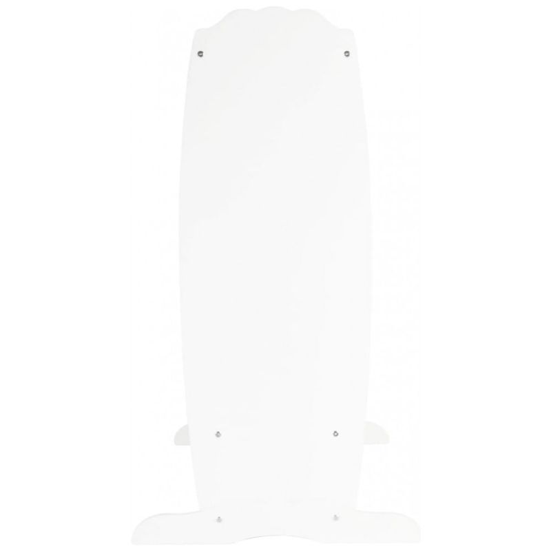 Na lateral frontal, o armário possui espelho em altura infantil, permitindo que as crianças visualizem suas combinações de roupas e fantasias. O design foi desenvolvido para estimular a autonomia, facilitando que as crianças escolham, vistam e guardem suas peças de forma independente.