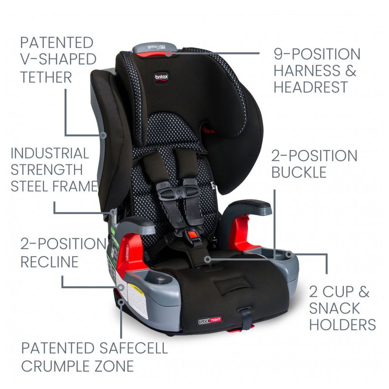 Escolha uma cadeirinha de carro infantil que cresça com seu filho com a cadeirinha de carro Britax Grow With YouTM ClickTightR arnês2booster Este assento elevatório com encosto alto começa como uma cadeirinha de carro com arnês de 5 pontos e se converte em um reforço de posicionamento do cinto que funciona com o cinto de segurança do seu carro Instale sempre com confiança Com a tecnologia ClickTight você sabe que está certo em 3 etapas fáceis: abrir e fechar a fivela Ajuste rapidamente o arnês de 9 posições e o apoio de cabeça usando apenas uma mão para o ajuste adequado