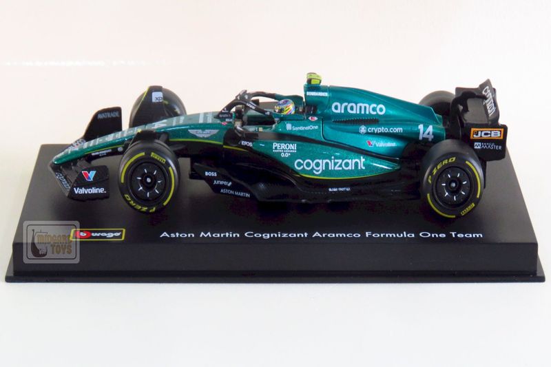 Aston Martin AMR23 - Fernando Alonso #14Marca do produto: Bburago.Coleção: Formula 1 2023.Pneus de Borracha.Acompanha Caixa de Acrílico com nome do scuderia gravado na base plástica.Versão com piloto no cockpit.Escala: 1/43 (aproximadamente 13 cm de comprimento, 4 cm de largura e 3 cm de altura).