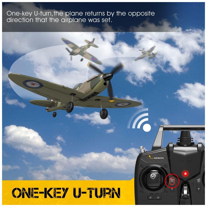 A função One Key Aerobatic permite realizar manobras incríveis com apenas um toque de botão, enquanto a função de retorno automático faz o avião voltar automaticamente para você. Por fim, a pintura sofisticada que simula o caça Warbird Spitfire da Segunda Guerra Mundial torna este produto mais do que um simples brinquedo, um hobby sofisticado.