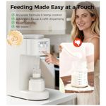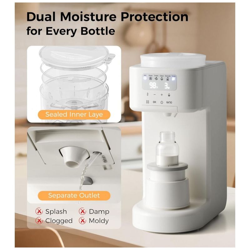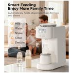 Dispensador automático de fórmula infantil Axababy Advanced prepara mamadeiras em cerca de 2 minutos com sensores precisos para dosagem de 60 a 300 ml em incrementos finos e 4 temperaturas selecionáveis (37°C, 40°C, 43°C, 45°C), simulando proporções de água e pó de fórmula de 30 ml a 300 ml e 0,1 g a 99 g. Projetado para uso prático em alimentação noturna ou diária, possui tanque de água de 2 L e saída separada para fórmula seca, evitando umidade e aglomeração.