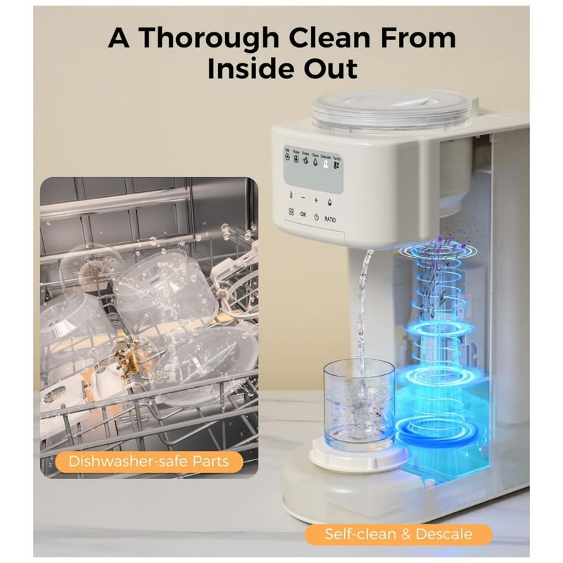 Funcionalidades: dispensação de água morna instantânea, proporções ajustáveis 1:1 a 1:10, tanque de fórmula com design anti-umidade.