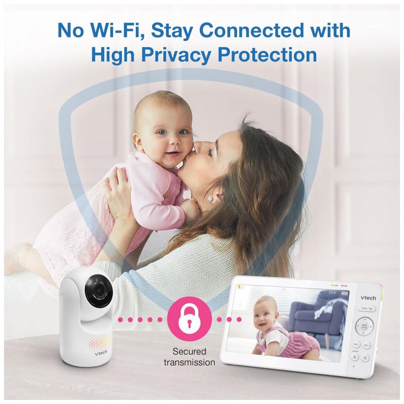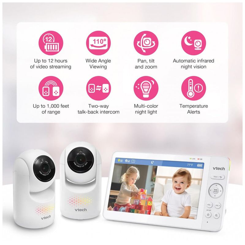 Mantenha seu bebê sempre seguro e sob controle com o Monitor de Bebê de Vídeo Digital Twin 17 cm VTech Advanced HQ Max. Com tela LCD IPS de 17 cm, este monitor oferece ampla visualização, cores precisas e clareza aprimorada. As câmeras possuem capacidade de panorâmica, inclinação e zoom de 4x, com ângulo de visão de 110 graus. Equipado com bateria recarregável de até 12 horas de streaming de vídeo, monitore a temperatura, movimento e som do quarto do bebê para manter um ambiente aconchegante. A visão noturna ativa em condições de pouca luz. Acalme seu bebê com luz noturna multicolorida, sons suaves e canções de ninar, juntamente com conversa bidirecional para acalmá-los quando estão angustiados. Com conexão sem fio segura de 2,4GHz e alcance impressionante de 300 metros, você pode se movimentar livremente pela casa sem interrupção na transmissão de vídeo. Sem necessidade de WiFi, basta ligar e começar a monitorar com facilidade.