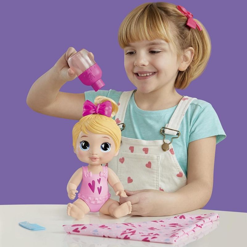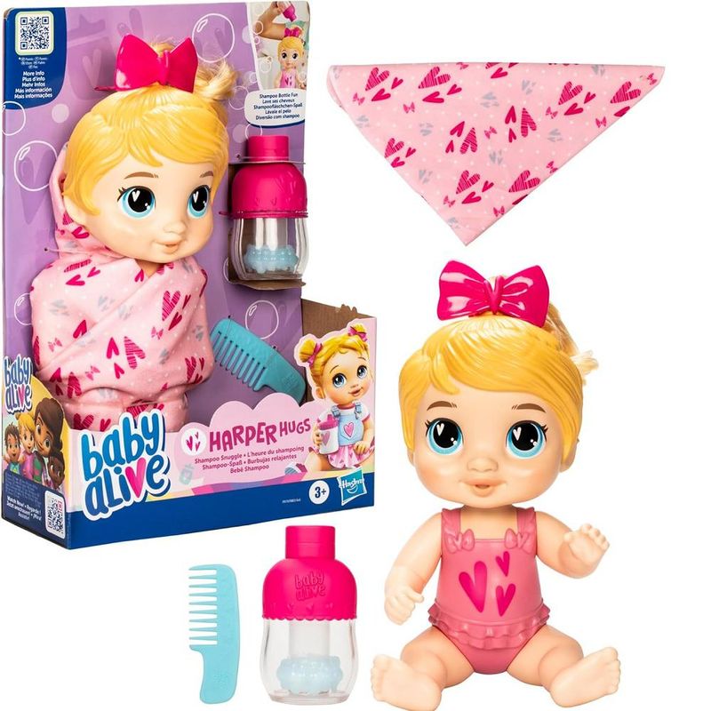 A Baby Alive Bebê Shampoo Harper Hugs chegou para transformar a hora do banho!\n\nCom 28 cm de altura, cabelos loiros e um jeitinho encantador. O frasco com bolhas de mentirinha é pura magia: basta incliná-lo para ver as bolhas subirem e descerem! E depois do banho? É só enrolar a boneca na toalha macia com fechos e criar penteado.
