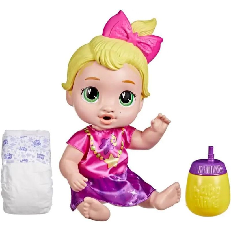 Este conjunto de boneca bebé Baby Alive Pequenos Goles promete muita diversão afetiva! Para cuidar da pequena boneca bebé que bebe e molha a fralda. Enche o biberão da boneca com água que ela consegue mesmo beber. Depois, é hora de mudar a fralda, com a fralda para bonecas incluída. As crianças podem também usar o acessório sem água, para brincar sem sujar. A boneca tem cabelo de plástico loiro e 28 cm de altura. Os brinquedos Baby Alive, para meninas e meninos de 3 anos, são ideais para imaginar histórias fofas e grandes aventuras!