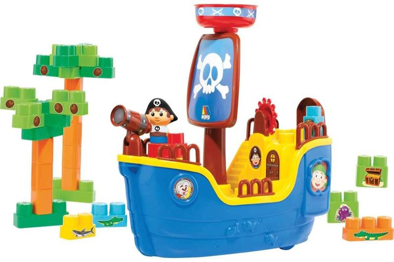 CONTEÚDO: Barco composto por 22 peças, 30 blocos de montar e 1 cartela de adesivos. Faixa etária indicada: 12-36 meses de idade."