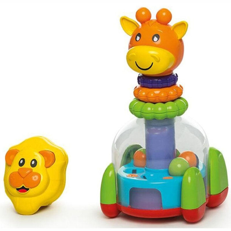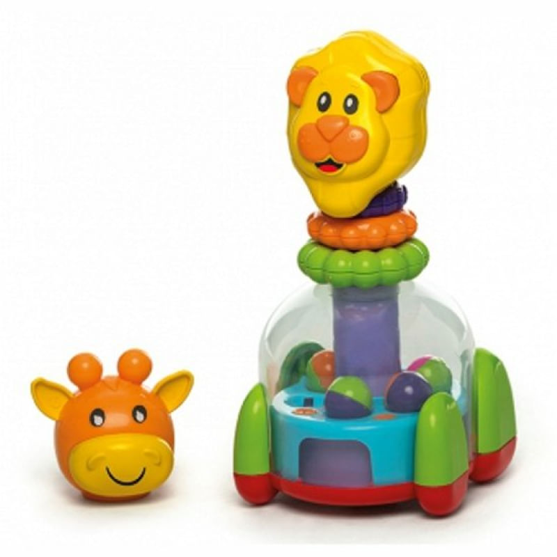 A cada argola encaixada é uma comemoração. A surpresa fica ainda melhor, apertando a cabeça dos bichinhos o brinquedo gira, fazendo as bolinhas caírem em cada plataforma da base. É muito divertido.