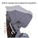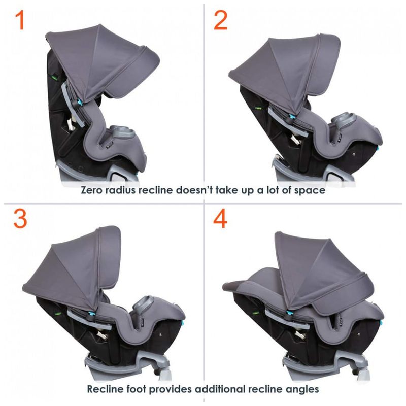 Inclui encosto de cabeça integrado sem arnês recauchutado. Três posições reclináveis que permitem que os passageiros do assento dianteiro tenham espaço extra para as pernas, enquanto um pé reclinável integrado oferece ajuste duplo e dá o ângulo certo com facilidade.