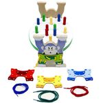 Descritivo detalhado: Confeccionado em M.D.F. 26 peças. Base: Oval com 16 orifícios vazados com 2 laterais em forma de gorila, pintado e serigrafado em tinta ultravioleta atóxica. 4 roupas em forma de macacão coloridas que servem de alinhavos. 4 cadarços coloridos de poliéster, 1 martelo de madeira e 16 pinos de madeira pintados com tinta atóxica. Gorila 27,5 x 22 x 20 cm, martelo 18,5 x 5 x 4 cm, pinos 8 cm, cadarços aproximadamente 70 cm de comprimento. Embalagem: Caixa de papelão de onda dupla. Lacrado com película de P.V.C. encolhível.