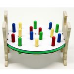 Esse brinquedo proporciona duas atividades diferentes. Na base central a criança brinca com o bate martelo e nas laterais, com os alinhavos.